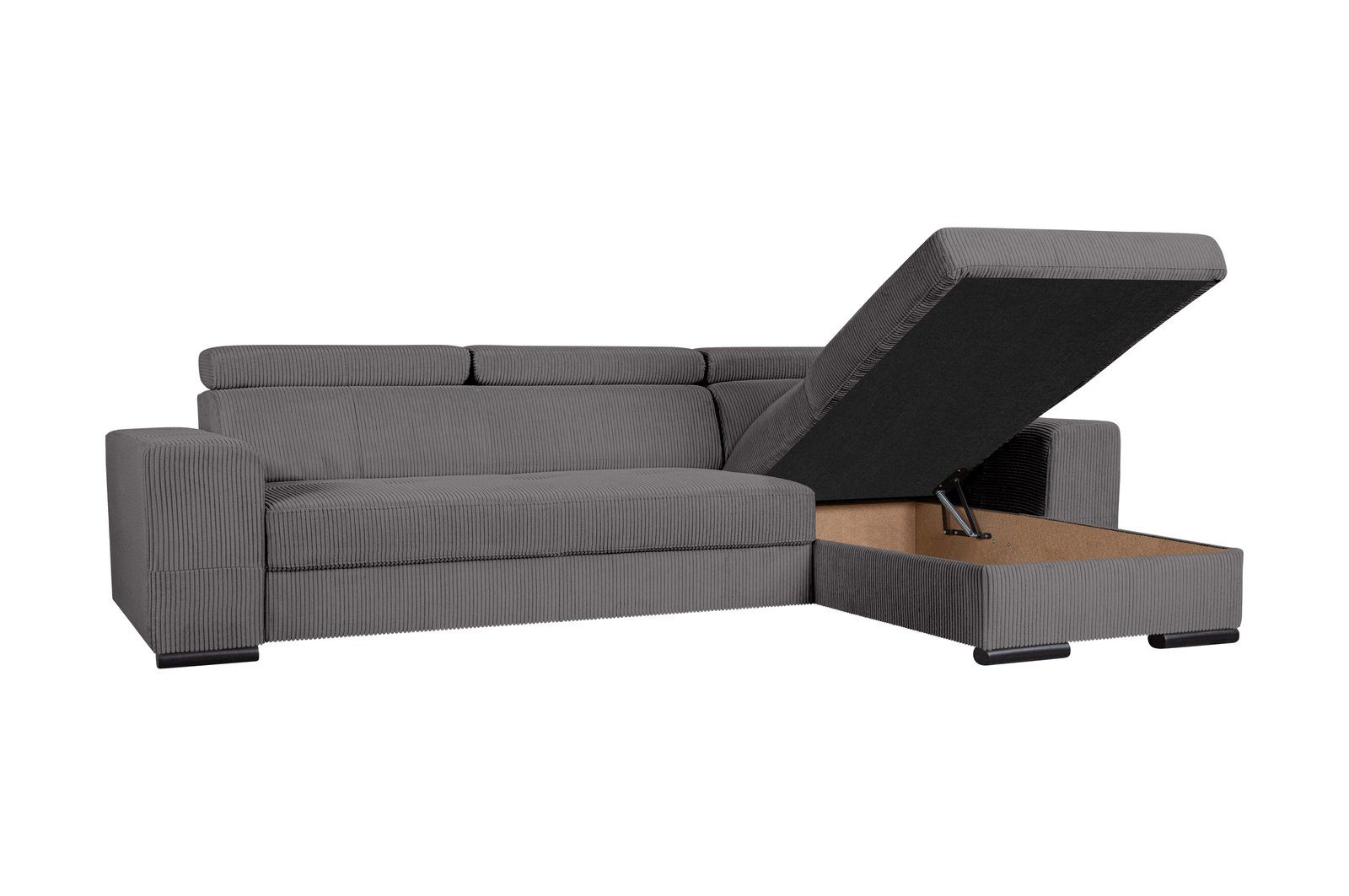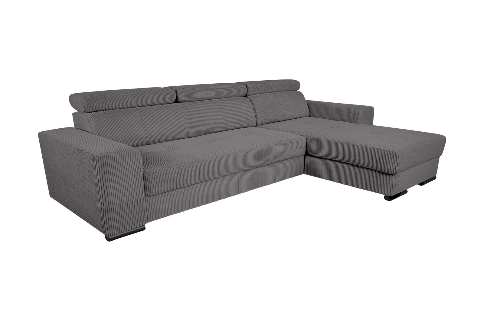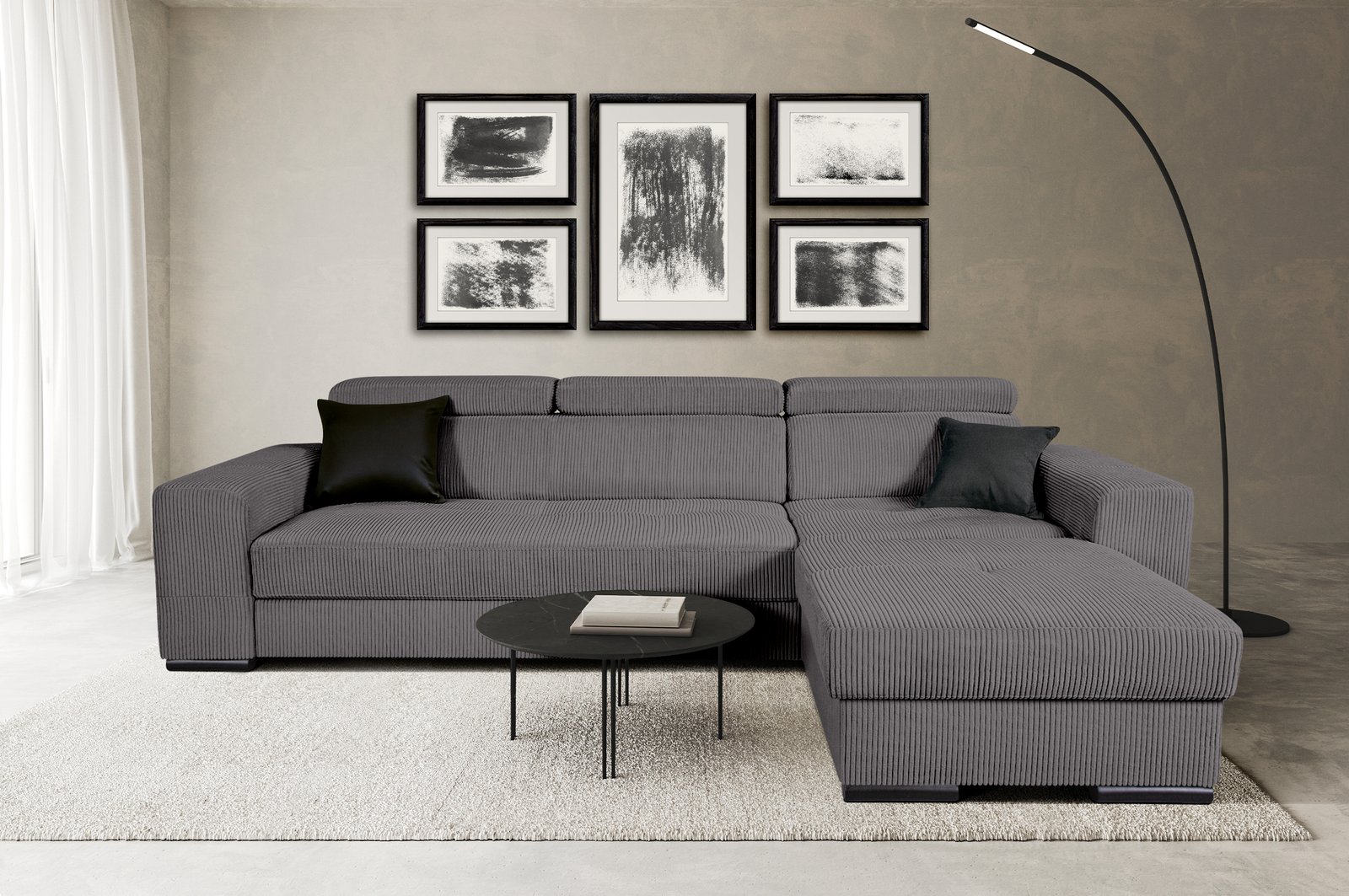 Šiuolaikiška kampinė sofa su integruotu miegamuoju mechanizmu, talpia daiktadėže ir reguliuojamais galvos atlošais – idealus pasirinkimas tiek kasdieniam poilsiui, tiek netikėtiems svečiams. Pasirinkimas tarp Lincoln veliūro ar Poso struktūrinio audinio leidžia pritaikyti sofą prie jūsų interjero stiliaus.